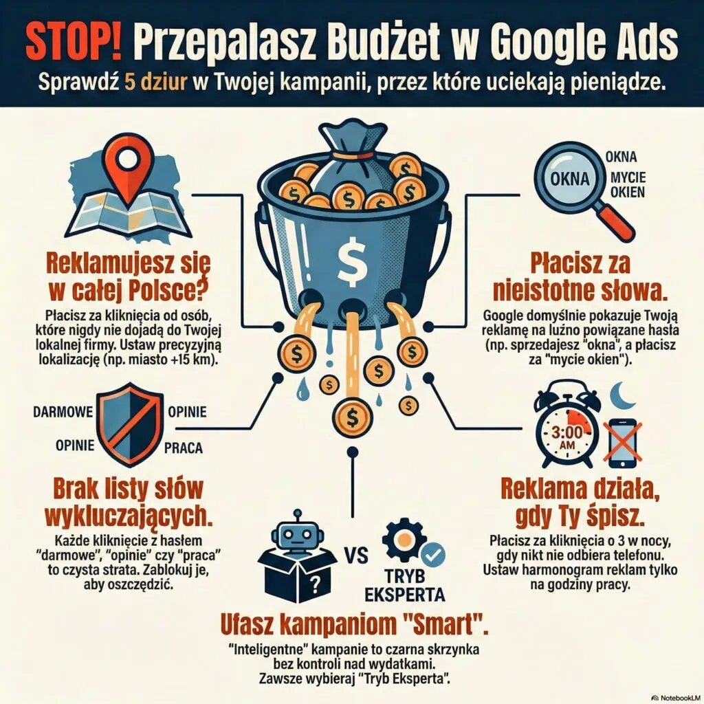 Jako Pan od Reklamy widziałem dziesiątki kont firm z Trójmiasta, gdzie pieniądze uciekały szerokim strumieniem przez proste błędy konfiguracyjne. Dziś pokażę Ci 5 dziur w Twoim wiadrze z budżetem i powiem, jak je zatkać.