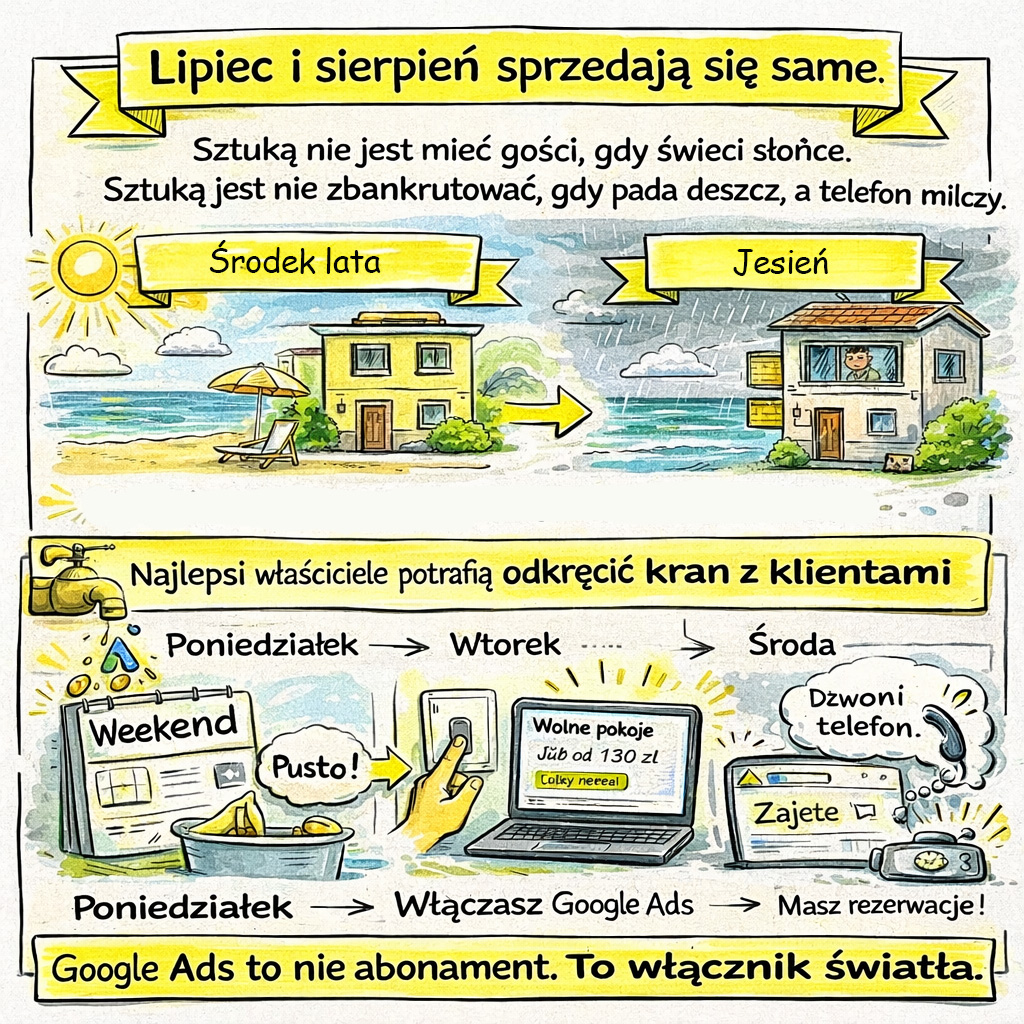 Lipiec i sierpień sprzedają się same. Sztuką nie jest mieć gości, gdy świeci słońce. Sztuką jest nie zbankrutować, gdy pada deszcz, a telefon milczy.